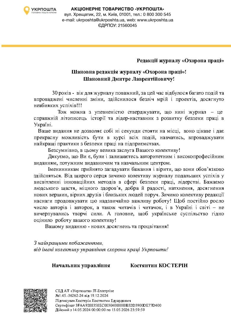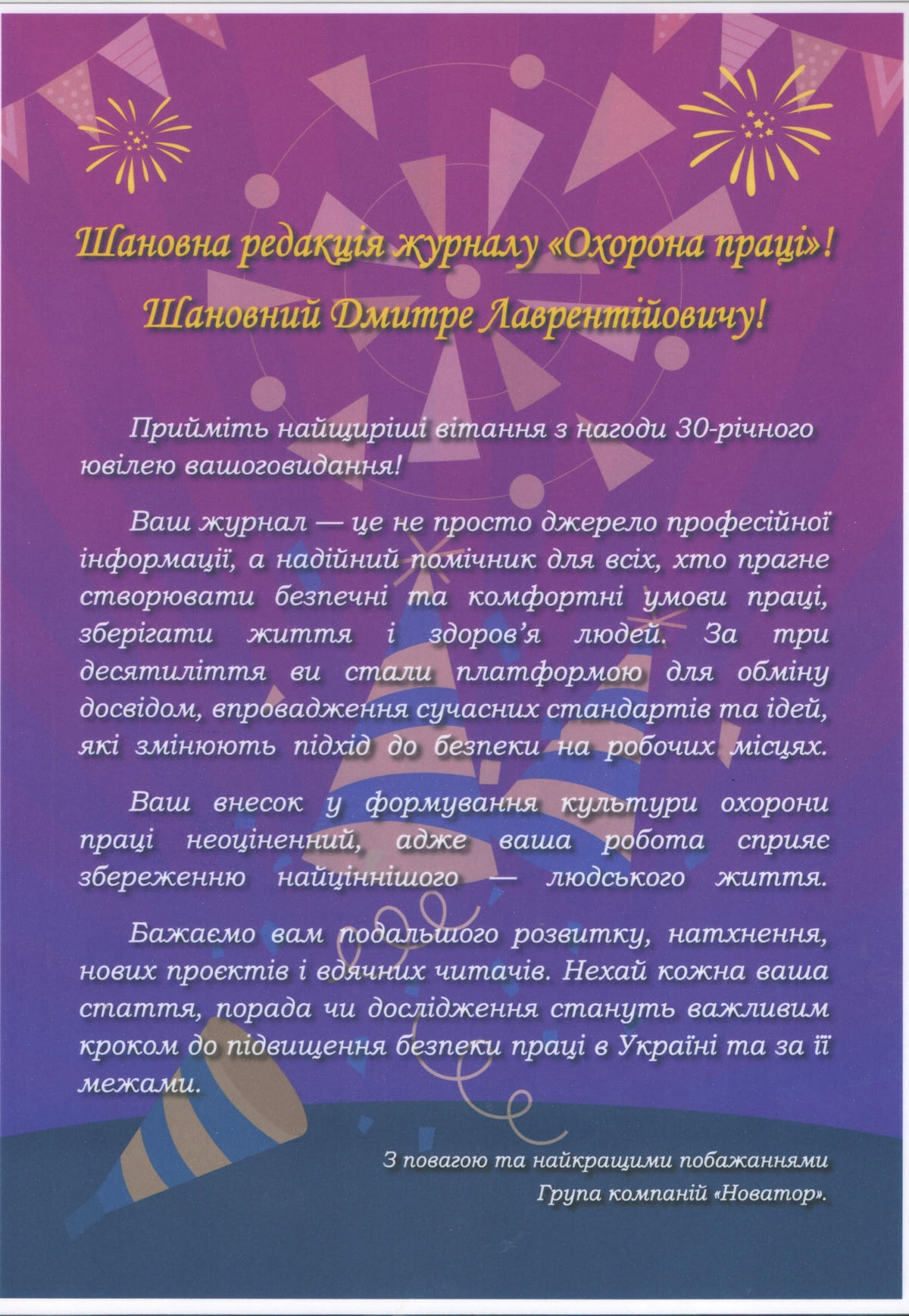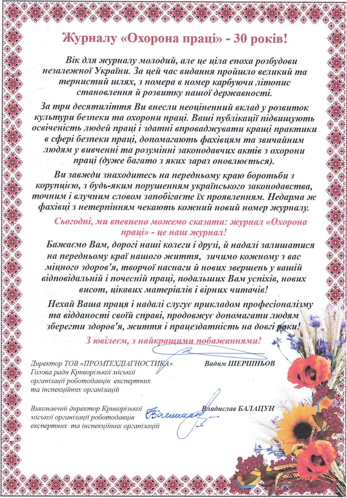 Звісно, як і годиться на день народження, на адресу часопису було сказано багато гарних щирих слів. Ось лише деякі з них: «30 років для будь-якої організації – серйозна перевірка на професіоналізм і актуальність, оперативність і чесність». «Ваш журнал – це не просто джерело професійної інформації, а надійний помічник для всіх, хто прагне створювати безпечні та гідні умови праці». «Видання не дозволяє собі ні секунди стояти на місці, воно цікаве, змістовне, надає можливість бути в курсі всіх подій, навчатись, упроваджувати найкращі практики з безпеки праці». «Журнал став надійним путівником для фахівців у сфері охорони праці, роботодавців і працівників та об’єднав зусилля заради створення безпечного майбутнього». «Ви побудували потужний майданчик для обміну досвідом і професійного зростання». «Ваша команда – молодці! Руху вперед! Гарних людей на шляху!»