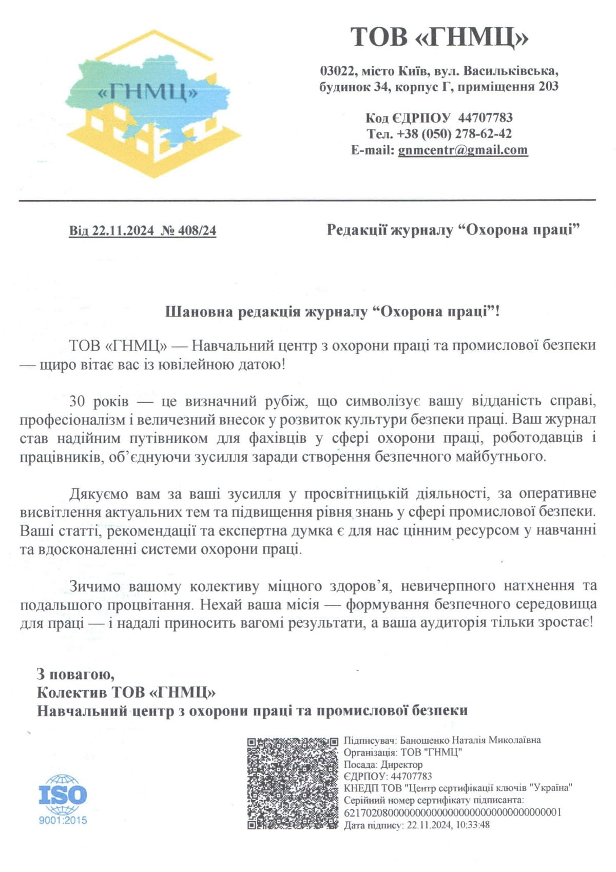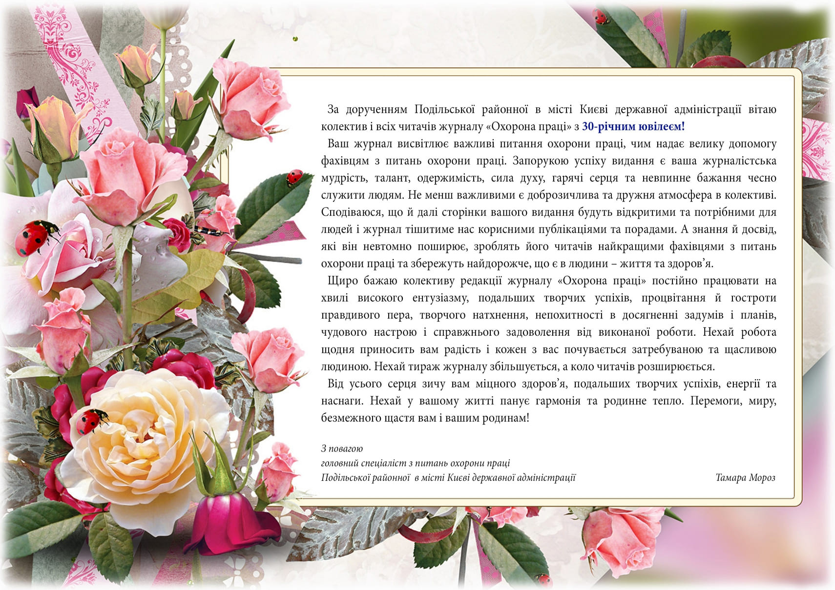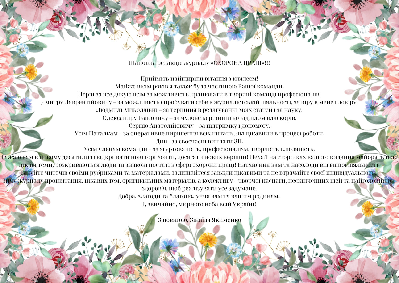 Звісно, як і годиться на день народження, на адресу часопису було сказано багато гарних щирих слів. Ось лише деякі з них: «30 років для будь-якої організації – серйозна перевірка на професіоналізм і актуальність, оперативність і чесність». «Ваш журнал – це не просто джерело професійної інформації, а надійний помічник для всіх, хто прагне створювати безпечні та гідні умови праці». «Видання не дозволяє собі ні секунди стояти на місці, воно цікаве, змістовне, надає можливість бути в курсі всіх подій, навчатись, упроваджувати найкращі практики з безпеки праці». «Журнал став надійним путівником для фахівців у сфері охорони праці, роботодавців і працівників та об’єднав зусилля заради створення безпечного майбутнього». «Ви побудували потужний майданчик для обміну досвідом і професійного зростання». «Ваша команда – молодці! Руху вперед! Гарних людей на шляху!»