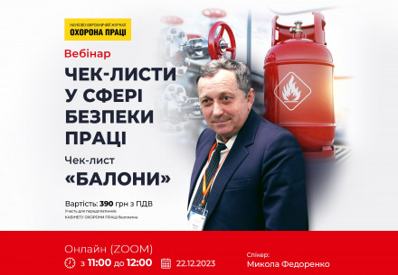 Вебінар на тему «Чек-листи у сфері безпеки праці. Чек-лист “Балони”. Фахова оцінка та рекомендації» 22 грудня 2023 року 11.00–12.00 ZOOM Вартість: 390 грн з ПДВ Участь для передплатників КАБІНЕТУ ОХОРОНИ ПРАЦІ безплатна Спікер: Микола Федоренко  Зареєструватись    Десятий вебінар із циклу вебінарів про застосування чек-листів у сфері безпеки праці. Під час...