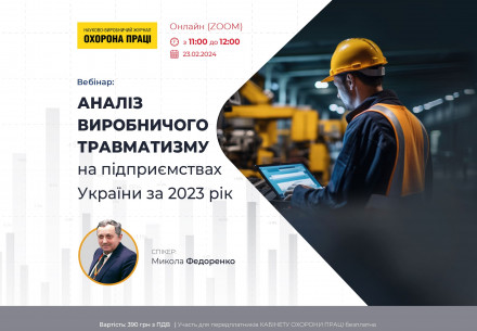 Вебінар на тему «Аналіз виробничого травматизму на підприємствах України за 2023 рік»                             23 лютого 2024 року 11.00–12.00 ZOOM Вартість: 390 грн з ПДВ Участь для передплатників КАБІНЕТУ ОХОРОНИ ПРАЦІ безплатна Спікер: Микола Федоренко  Зареєструватись    Виробничий травматизм – зворотний, темний бік виробництва, який вказує на хиби у функціонуванні СУОП підприємства. Яким...
