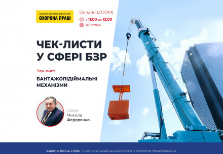 Вебінар на тему «Чек-листи у сфері БЗР. Чек-лист “Вантажопідіймальні механізми”. Фахова оцінка та рекомендації» 26 січня 2024 року 11.00–12.00 ZOOM Вартість: 390 грн з ПДВ Участь для передплатників КАБІНЕТУ ОХОРОНИ ПРАЦІ безплатна Спікер: Микола Федоренко  Зареєструватись     Одинадцятий вебінар із циклу вебінарів про застосування чек-листів у сфері безпеки праці. Під час...