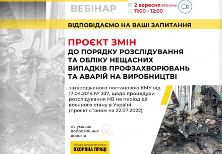 ВЕБІНАР «Відповідаємо на ваші запитання. Проєкт змін до Порядку розслідування та обліку нещасних випадків, професійних захворювань та аварій на виробництві, затвердженого постановою КМУ  від 17.04.2019 № 337, щодо процедури розслідування нещасних випадків на період дії воєнного стану в Україні (проєкт станом на 22.07.2022)»  це продовження вебінару від 12 серпня 2022...