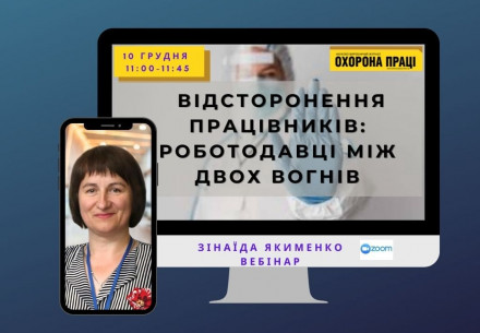 Вебінар "Відстороненння працівників: роботодавці між двох вогнів" 10 грудня, 11:00-11:45 ZOOM Експерт: Зінаїда Якименко, корреспондент журналу «Охорона праці», 16 років юридичної практики Точкою відліку періоду відсторонення працівників стало 8 листопада 2021 року – дата набрання чинності наказу МОЗ від 04.10.2021 № 2153 «Про затвердження Переліку професій, виробництв та організацій, працівники...