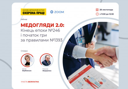 Вебінар на тему: «МЕДОГЛЯДИ 2.0: кінець епохи № 246 і початок гри за правилами № 1393» Обов’язкові медичні огляди працівників: нові правила, нові ризики, нові вимоги. Що змінив МОЗ і що тепер з цим робити підприємствам? Про новації, нюанси та проблемні питання нового нормативного акта.   28 листопада, 11:00–12:30, онлайн (ZOOM)...
