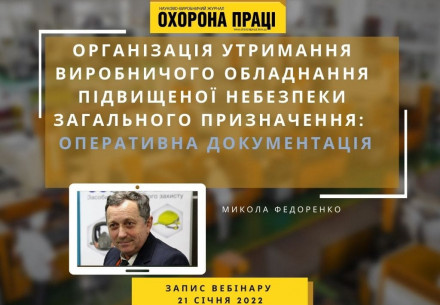 Вебінар "Організація утримання виробничого обладнання підвищеної небезпеки загального призначення:  Перевірка технічного стану. Періодичність. Граничний строк експлуатації"  Вебінар для передплатників КАБІНЕТУ ОХОРОНИ ПРАЦІ Шановні передплатники КАБІНЕТУ ОХОРОНИ ПРАЦІ! Запрошуємо вас на зустріч # 22 24 грудня, 11:00-11:45 ZOOM Експерт: Федоренко Микола, заступник головного редактора журналу «Охорона праці» У вебінарі: Функції контролю...