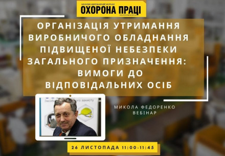 Вебінар "Організація утримання виробничого обладнання підвищеної небезпеки загального призначення:  вимоги до відповідальних осіб 26 листопада, 11:00-11:45 ZOOM Експерт: Федоренко Микола, заступник головного редактора журналу «Охорона праці» У вебінарі:   Нормативна база. НПАОП. Загальні мінімальні вимоги Термінологія: обладнання та устаткування, утримання та експлуатація Організація засобів виробництва Організація нагляду за технічним станом виробничого...