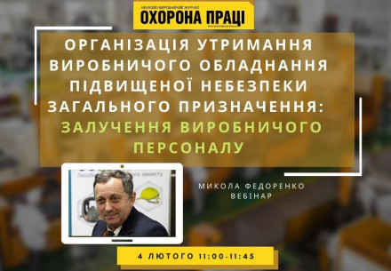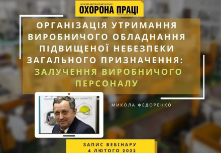 Вебінар "Організація утримання виробничого обладнання підвищеної небезпеки загального призначення. Перелік оперативної документації  щодо залучення виробничого персоналу. Допуск до роботи"  4 лютого, 2022 11:00-11:45 ZOOM Експерт: Федоренко Микола, заступник головного редактора журналу «Охорона праці» У вебінарі: Порядок залучення виробничого персоналу Нормативи виробничого персоналу Електрогосподарство. Виробничий персонал. Організаційна документація Газове господарство. Виробничий...