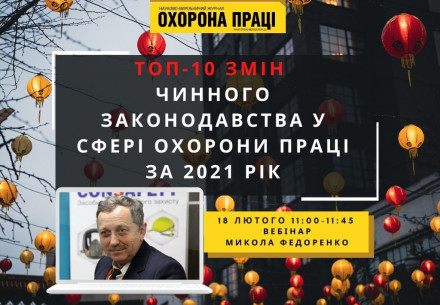 18 лютого вебінар "ТОП-10 змін чинного законодавства у сфері охорони праці у 2021 році"  18 лютого 11:00-11:45 ZOOM За даними моніторингу журналу «Охорона праці», до чинного законодавства у сфері охорони праці у 2021 році внесено понад 150 змін. І деякі з них вже суттєво вплинули або вплинуть у 2022 році...