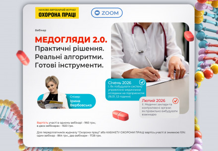 Цикл вебінарів на тему «МЕДОГЛЯДИ 2.0. Практичні рішення. Реальні алгоритми. Готові інструменти»   Січень 2026 року І. Як побудувати систему управління медичними оглядами на підприємстві (16.01, 1,5 години)   Лютий 2026 року ІІ. Медичні заклади та контролюючі органи: як правильно вибудувати взаємодію   Онлайн (ZOOM) Спікер: Ірина Вербовська, експерт з практичних рішень в...