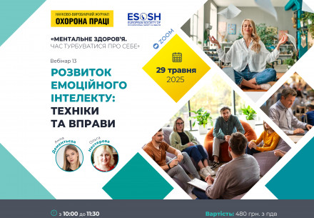 Вебінар 13. Розвиток емоційного інтелекту: техніки та вправи Цикл вебінарів на тему «Ментальне здоров’я. Час турбуватися про себе». Частина 2   Дата: 29 травня 2025 року, 10.00–11.30 Вартість: 480 грн з ПДВ ZOOM, надаємо запис вебінарів Організатори: редакція журналу «Охорона праці», Європейське співтовариство з охорони праці (ESOSH)   Детальніше про вебінар
