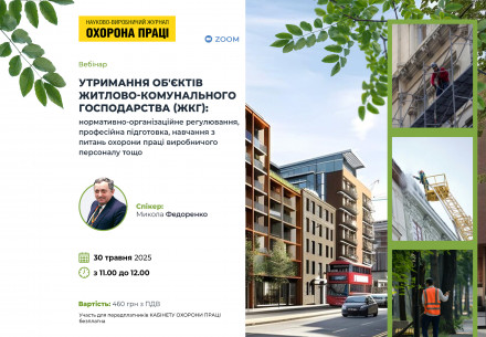 Вебінар на тему «Утримання об’єктів житлово-комунального господарства (ЖКГ): нормативно-організаційне регулювання, професійна підготовка, навчання з питань охорони праці виробничого персоналу тощо»   Дата: 30 травня 2025 року 11.00–12.00 ZOOM Вартість: 460 грн з ПДВ Участь для передплатників КАБІНЕТУ ОХОРОНИ ПРАЦІ безплатна Спікер: Микола Федоренко, у минулому головний державний інспектор з охорони праці...