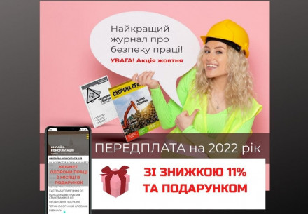 АКЦІЯ 1. Передплати журнал на 2022 рік зі знижкою 11% та отримай у подарунок КАБІНЕТ ОХОРОНИ ПРАЦІ повний доступ на 2 місяці Журнал "Охорона праці" - щомісячне, повноформатне, багатоколірне, ілюстроване видання на 64 сторінках з додатком «На допомогу спеціалісту з охорони праці». Загальний тираж понад 4 тис. примірників. Актуальні теми...