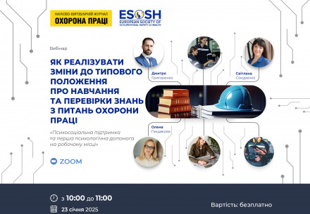 Вебінар на тему "Як реалізувати зміни до Типового положення про порядок проведення навчання та перевірки знань з питань охорони праці"   Дата: 23 січня 2025 року, з 10.00 до 11.00 Формат: ZOOM Участь безкоштовна! Детальніше про вебінар