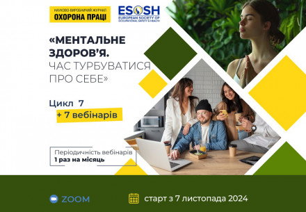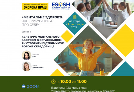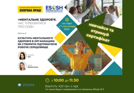 Вебінар 8. Культура ментального здоров’я в організаціях: як створити підтримуюче робоче середовище Цикл вебінарів на тему «Ментальне здоров’я. Час турбуватися про себе». Частина 2     Дата: 7 листопада 2024 року, 10.00–11.30 Вартість: 480 грн з ПДВ ZOOM, надаємо запис вебінарів Організатори: редакція журналу «Охорона праці», Європейське співтовариство з охорони праці (ESOSH)...