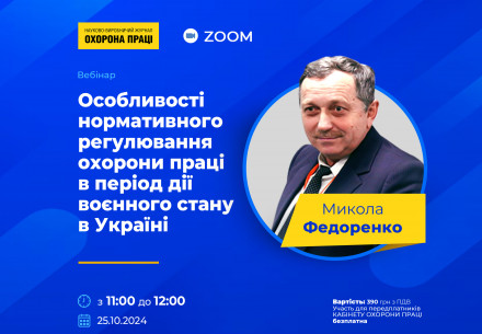 Вебінар на тему «Особливості нормативного регулювання охорони праці в період дії воєнного стану в Україні»   25 жовтня 2024 року 11.00–12.00 Онлайн (ZOOM) Спікер: Микола Федоренко Вартість: 390 грн з ПДВ Участь для передплатників КАБІНЕТУ ОХОРОНИ ПРАЦІ безплатна Детальніше про вебінар