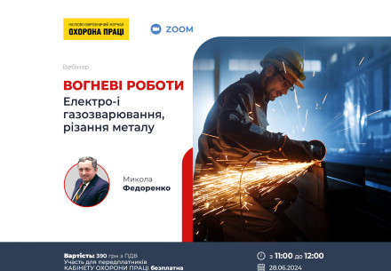 Вебінар на тему «Чек-листи у сфері БЗР. Чек-лист "Вогневі роботи (Електро- і газозварювання, різання металу)"»   28 червня 2024 року з 11.00 до 12.00 Онлайн (ZOOM) Спікер: Микола Федоренко Вартість: 390 грн з ПДВ Участь для передплатників КАБІНЕТУ ОХОРОНИ ПРАЦІ безплатна Детальніше про вебінар