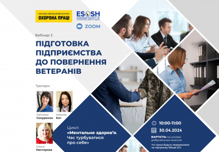 Вебінар 3. Підготовка підприємства до повернення ветеранів Цикл вебінарів на тему «Ментальне здоров’я. Час турбуватися про себе»  Дата: 30 квітня 2024 року, 10.00–11.00 ZOOM, надаємо запис вебінарів Організатори: редакція журналу «Охорона праці», Європейське співтовариство з охорони праці (ESOSH)    Тренери:   Світлана Сокуренко, сертифікований експерт Європейського співтовариства з охорони праці (ESOSH); координатор...