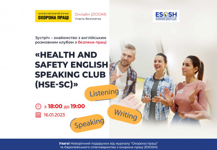 Увага! Новорічний подарунок від журналу «Охорона праці» та Європейського співтовариства з охорони праці (ESOSH) Готуємо у 2024 році для фахівців з безпеки праці особливий подарунок – Health and Safety English Speaking Club (HSE-SC). Це щотижневі онлайн-зустрічі з вивчення та практикування англійської мови. Не чекайте на традиційні теми на кшталт «What...
