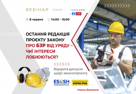 Вебінар на тему : Остання редакція проєкту Закону України «Про безпеку та здоров’я на роботі» від уряду. Чиї інтереси лобіюються?   8 червня 14:00–15:00 ZOOM + пряма трансляція у Facebook Організатори: ESOSH, Журнал «Охорона праці» Остання редакція проєкту Закону України «Про безпеку та здоров’я на роботі» від уряду. Чиї інтереси лобіюються?...