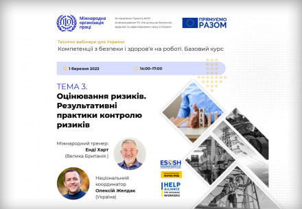 Технічні вебінари для України «Компетенції з безпеки і здоров'я на роботі. Базовий курс». Вебінар № 3. «Оцінювання ризиків. Результативні практики контролю ризиків» 01 березня 2023, 16:00–19:00 БЕЗПЛАТНО Тренер: Енді Харт (Велика Британія) Координатор: Олексій Желдак Зустріч у ZOOM, надаємо запис вебінарів Учасники отримують сертифікати в разі успішного складання тесту. Вебінари...